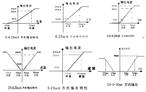 上面的六個特性圖中,F0mA或F4mA 流量是指用戶在M57窗口中輸入的值,F20mA流量是指用戶在M58窗口中輸入的值。對4-20mA和0-20mA方式,F0mA(或F4mA)和F20mA可以取正或負的流量值,只要使兩者不等值。對20-4-20mA和20-0-20mA方式,流量計忽略實際流量的正負, F0mA(或F4mA)和F20mA必須都取正值。